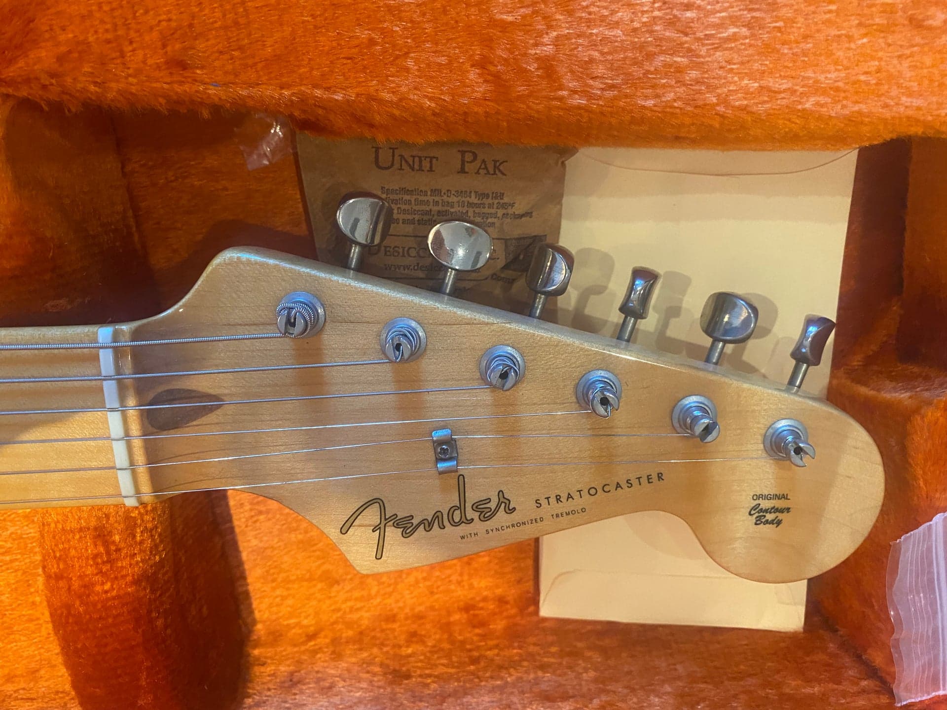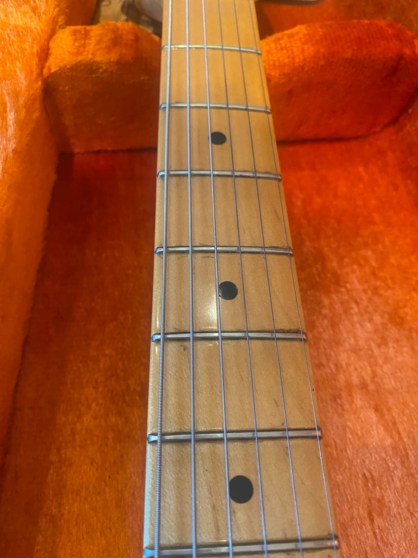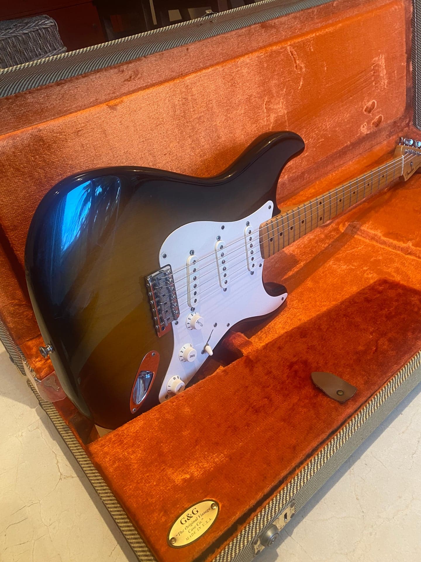 Fender American Vintage ’57 Stratocaster USA (reissue). Sonido clásico Strat, cuerpo de aliso, mástil de arce en “V”, acabado en laca nitro y pastillas American Vintage ’57/’62. Acabado Sunburst 2 tonos, trastes estilo vintage, radio 7.25”, cejuela de hueso sintético y clavijeros 6-en-línea. Tremolo sincronizado de 6 selletas. Incluye estuche tweed original. Tono auténtico años 50, ideal para amantes del sonido Fender. Escala: 25.5" (648 mm). Año 07/2005. Número de serie: V152609 Pequeñas marcas que obviamente no afectan al sonido de de esta pedazo guitarra.