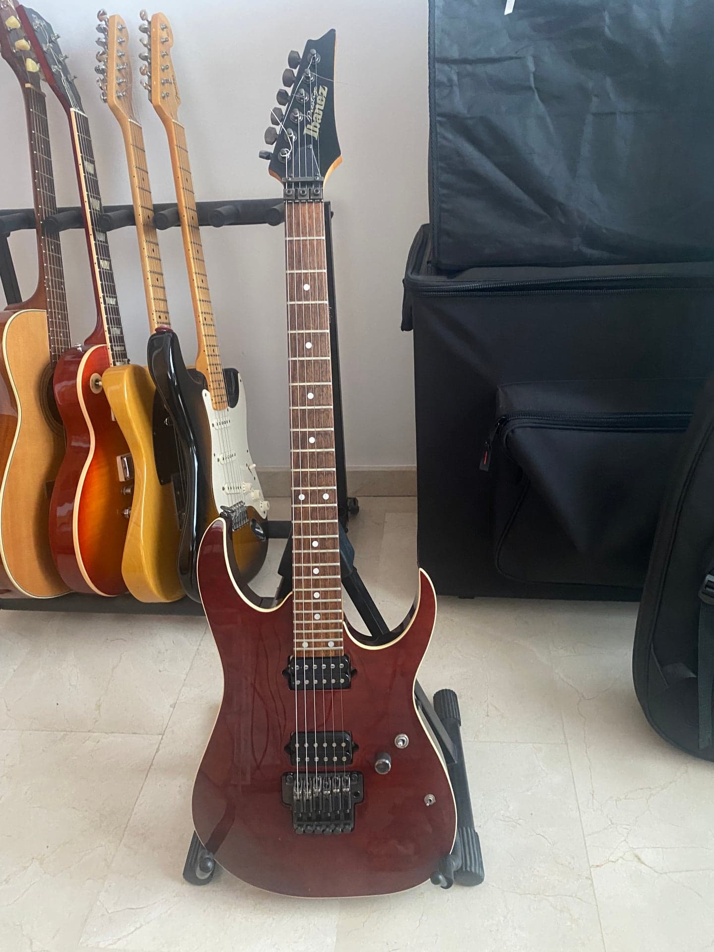 Ibanez Prestige RG2620QM fabricada en Japón (2003/2004) en muy buen estado. Cuerpo de caoba con tapa de arce flameado acabado Whisky Brown. Monta pastillas Suhr Aldrich (Neck 50 BK / Bridge 53 BK), sustituyendo las Dimarzio originales. Sonido potente, definido y con mucha claridad tanto en limpio como en distorsión. Incluye switch para coil split (HH a single) para sonidos más tipo strato. Puente Edge Pro (Floyd Rose) estable y preciso. 24 trastes jumbo. Número de serie: 29270. Guitarra muy versátil, ideal para rock/metal pero con gran rango tonal.